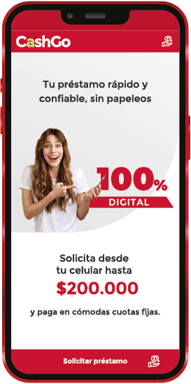 Nuestro crédito CashGo te ofrece préstamos desde $100.000 hasta $1.000.000 de pesos, con plazos que van de 5 a 30 días, y la opción de extenderlo hasta 30 días más. Los nuevos clientes pueden acceder a hasta $200.000, mientras que los clientes recurrentes con buen historial pueden solicitar hasta $1.000.000..